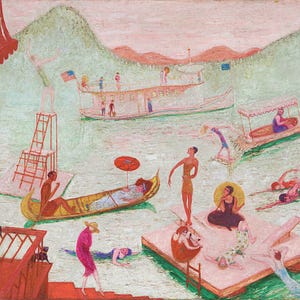 Stettheimer’s deliberate simplification of drawing, her repetitive figure style, and her relentlessly additive, crowded compositions can at first evoke “outsider art.” But there are two types of outsider art, one made from below and one from above. There is the outsider who is, at first, indifferent to the possibility that money might be made from art, and then there is the outsider who needs to make no money from her art…Stettheimer, like Proust, her beloved literary hero, enjoyed the detachment provided by wealth, the luxury—shared by Edith Wharton, Gerald Murphy, and Cole Porter—of making what she wanted.